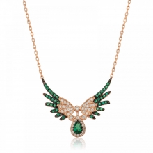 Zümrüt Yeşil Taşlı Melek Kanadı Bayan Gümüş Kolye, 925 ayar gümüşten üretilmiş ve zarif melek kanadı figürü ile süslenmiştir. Kolyenin ortasında yer alan zümrüt yeşili taş, kolyeye göz alıcı bir ışıltı katarken, melek kanadı figürü koruma ve rehberlik anlamını taşır. Bu kolye, hem şıklığı hem de derin anlamı ile sevdiklerinize özel bir hediye olarak sunulabilir ya da günlük kullanıma uygun şık bir aksesuar olarak tercih edilebilir.